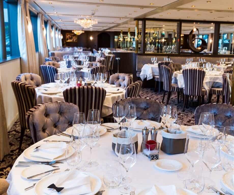 Budući da je prva večer, svi večeraju u restoranu s izborom juhe, tri predjela, šest glavnih jela i tri deserta. Odabrana crna, rosé i bijela vina – opet sve uključeno – odražavaju naše enološko hodočašće kroz neke od velikih vinskih regija Francuske: Cote du Rhône, Bordeaux, Burgundy.